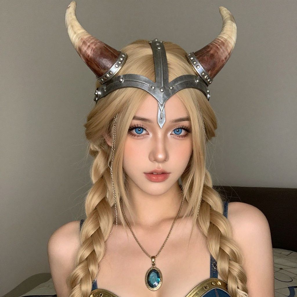"cosplay girl viking warrior, 1girl, solo, horns, fake horns, long hair, braid, looking at viewer, multiple braids, blonde hair, necklace, helmet, horned helmet, blue eyes, upper body, jewelry, horned headwear Realistic photo of casual sexy person with pretty face"