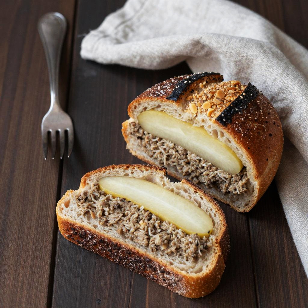 Still life composition featuring stoties bread sliced open with layers of traditional Scottish fillings, such as haggis and neeps, artistically arranged on a dark wood table with vintage utensils and a textured linen napkin.