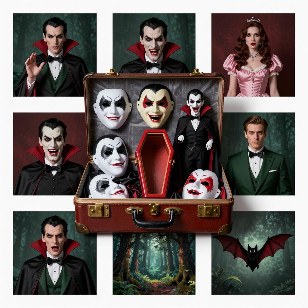 Photograph of a vintage suitcase filled with vampire-themed items, surrounded by eight smaller photographs. The suitcase contains multiple vampire masks, a small red coffin, and a figure in a vampire costume. Smaller photos include a vampire in a black cloak, a woman in a pink dress, a man in a green suit, a forest scene, and a bat in flight. The central suitcase is open, revealing the contents. The vampire masks have exaggerated, intense expressions.
