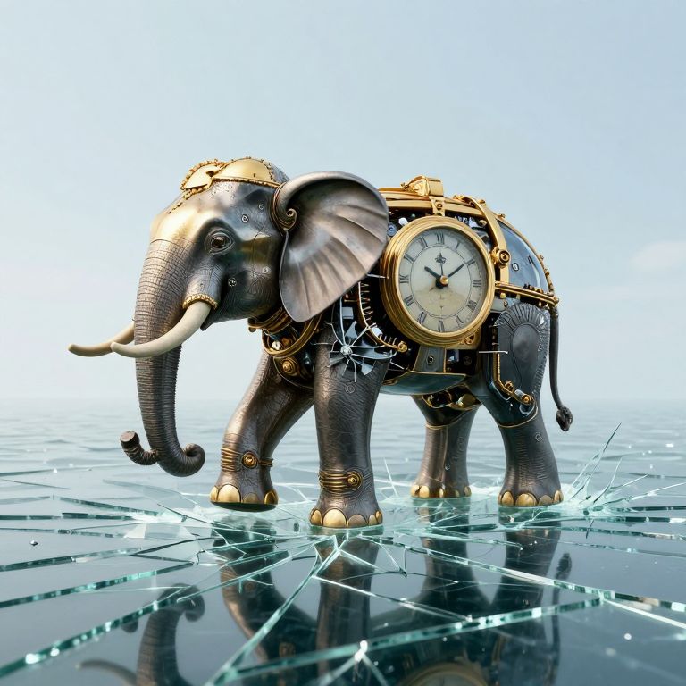 Clockwork elephant strides gracefully across a fractured glass ocean, its golden mechanical clock embedded in its side ticking rhythmically as each deliberate step repairs the shattered surface beneath.