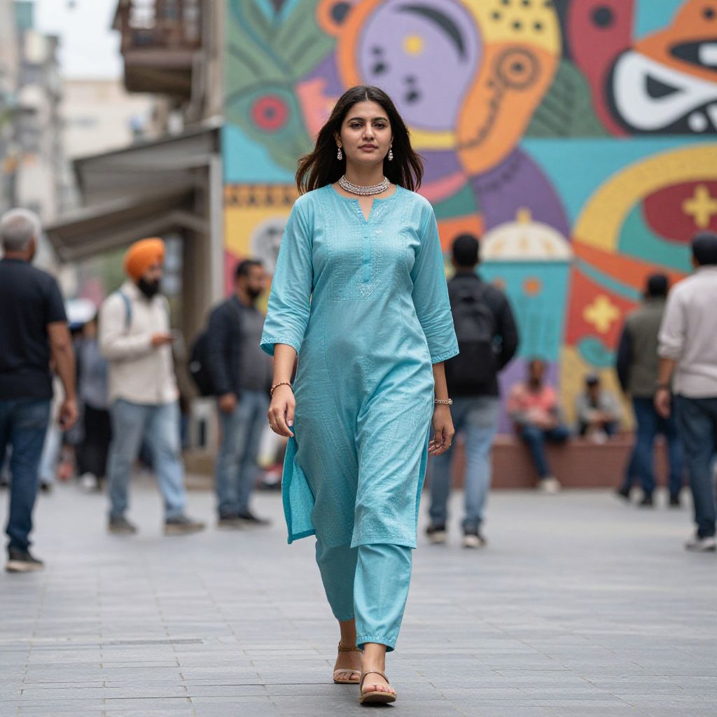 Best shalwar kameez prompt for Gemini: A festive shalwar kameez with colorful paisleys and mirror work, worn by a woman in a vibrant marketplace, full of cultural life, rendered with vibrant colors and dynamic composition in a Flux-style image.