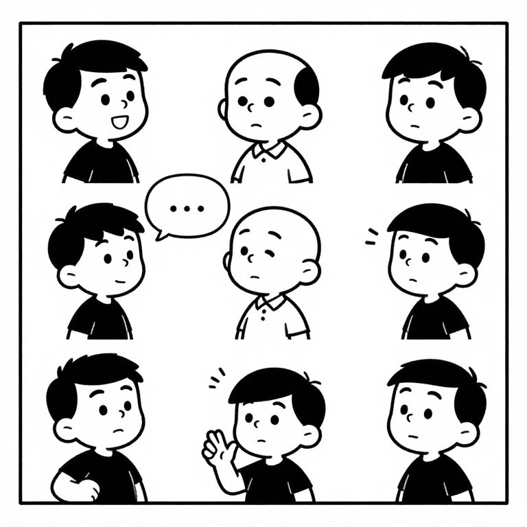 Black and white comic-style drawing of nine identical cartoon boys with black hair, in a 3x3 grid, showing various expressions and one speech bubble