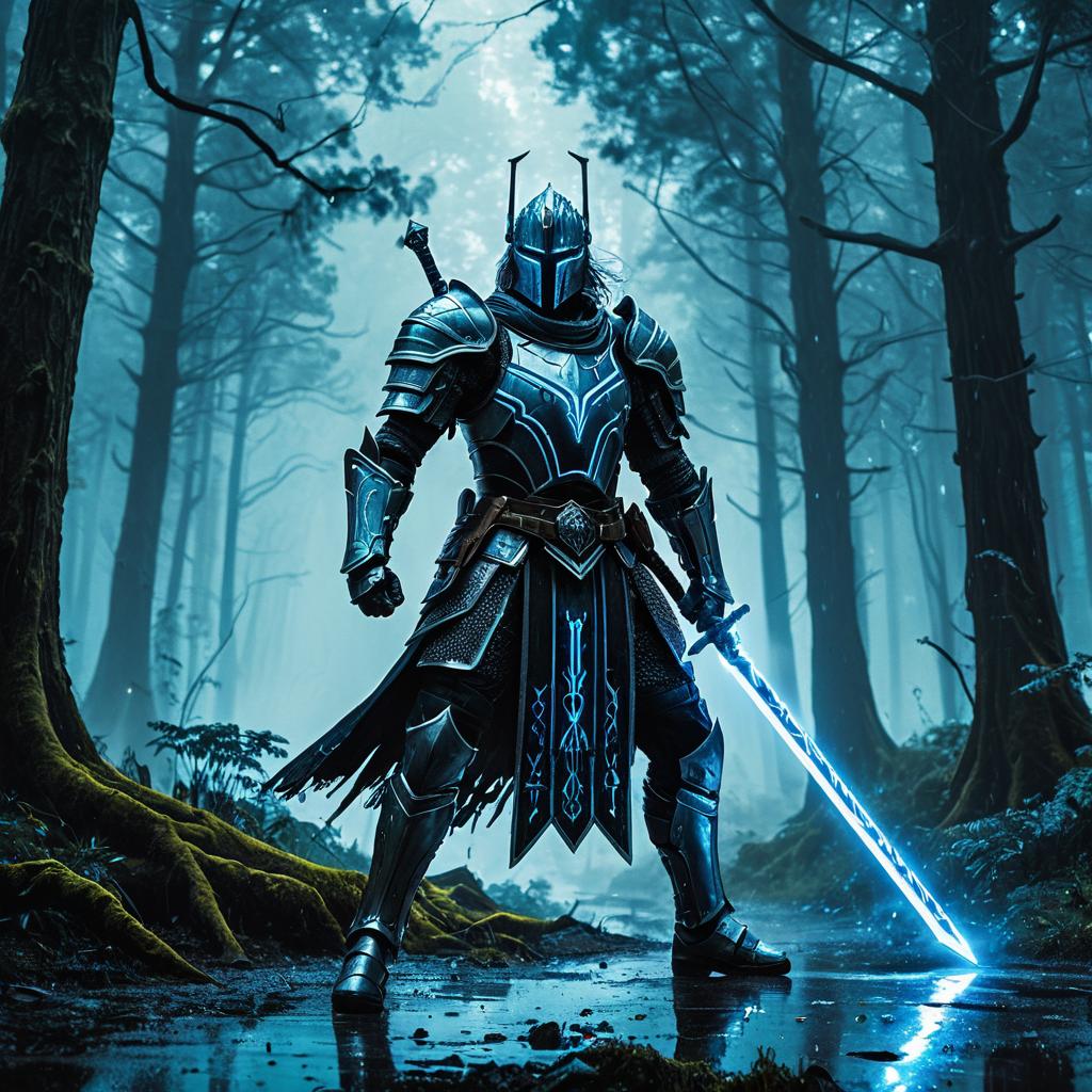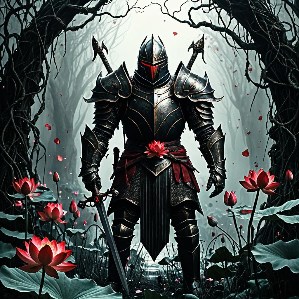 A dark fantasy scene featuring a brooding knight clad in intricate black armor with red accents, standing in a mystical forest surrounded by glowing red lotus blossoms and thorned vines. The knight holds a long sword, with two swords sheathed on his back, emerging ominously from the misty, enchanted setting.