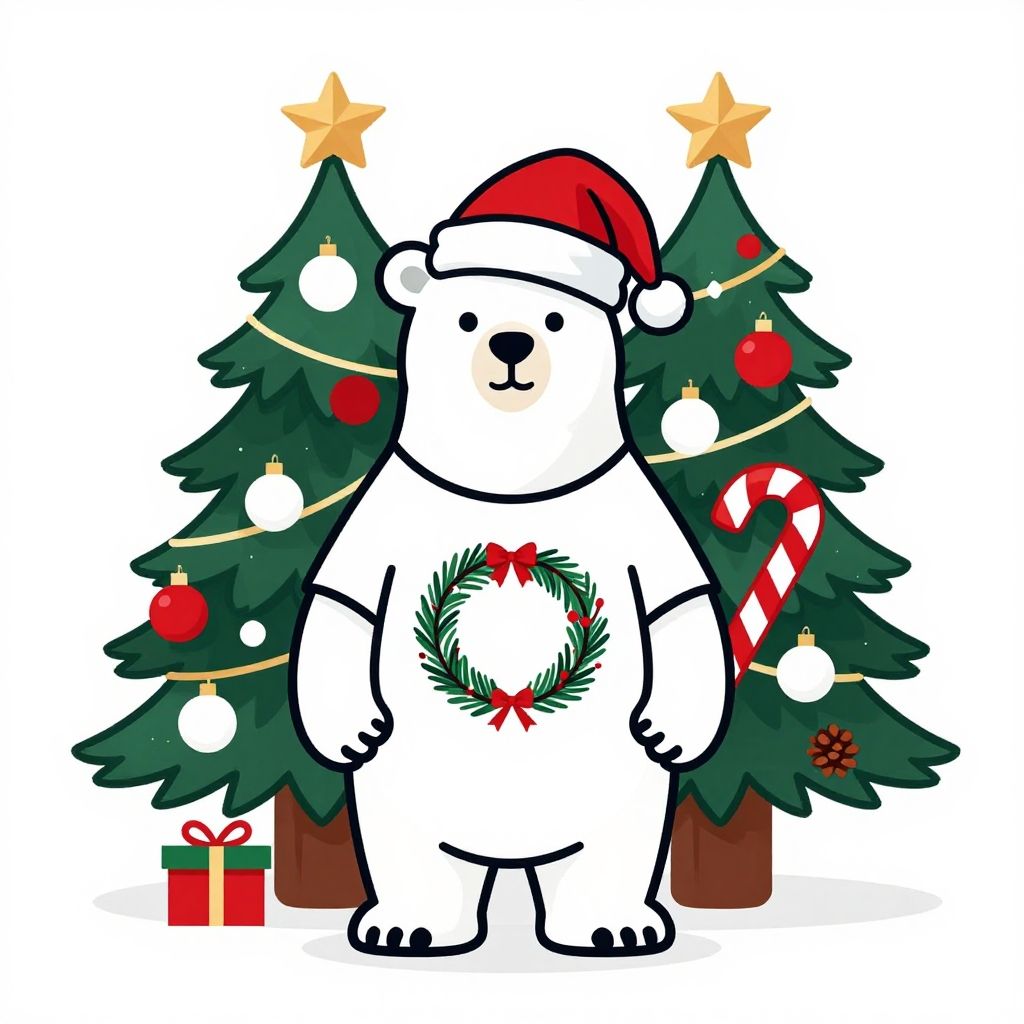 Cartoon white bear wearing red Santa hat and Christmas sweater with pine wreath, standing in front of decorated Christmas trees.