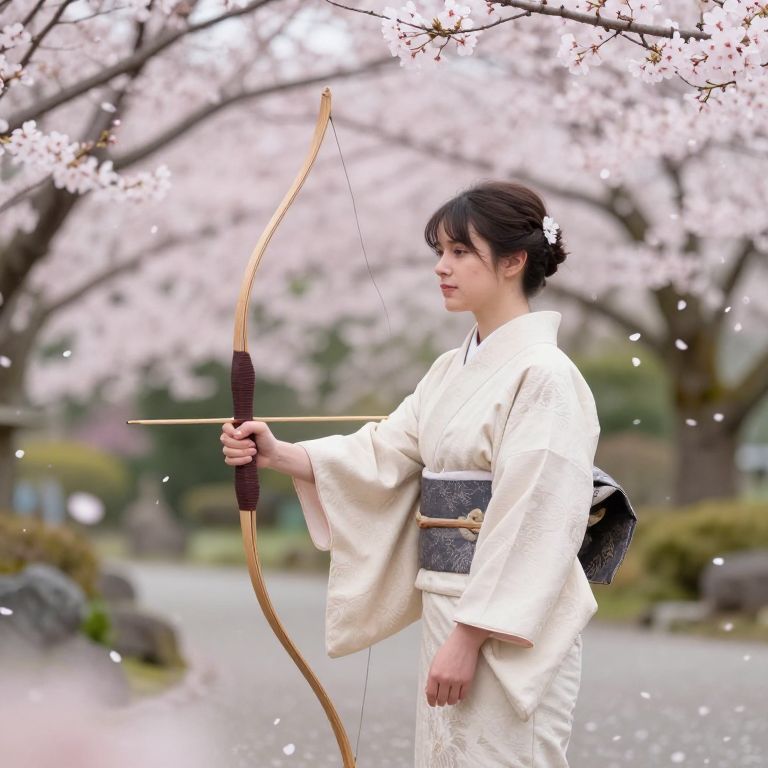 Photograph of an Asian woman in a white kimono, standing in a cherry blossom garden, drawing a traditional wooden bow. Pink cherry blossoms and