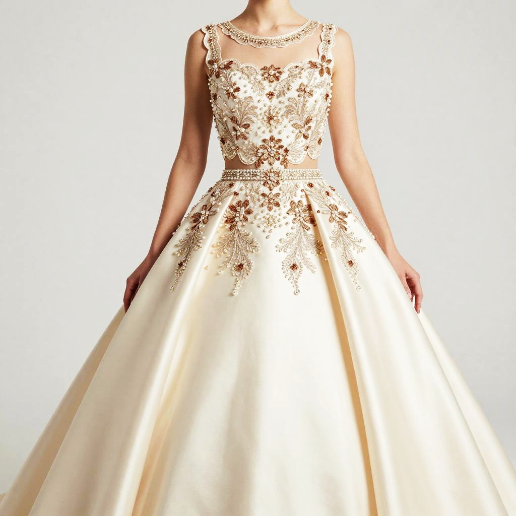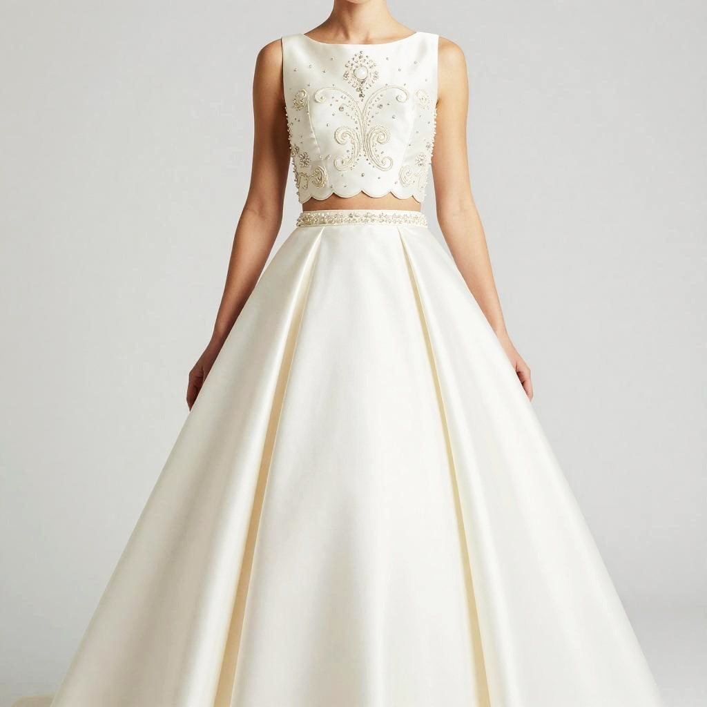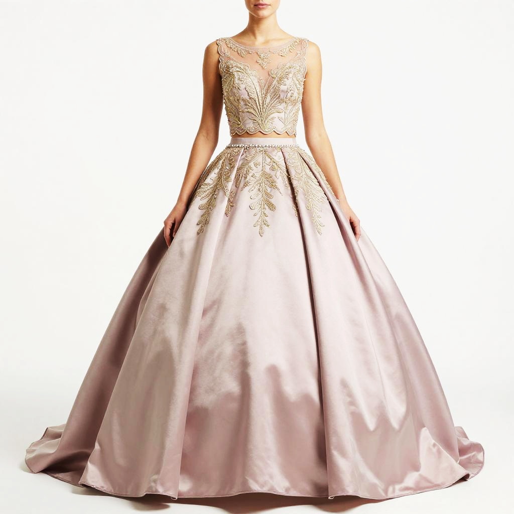 Woman, formal occasion, two-piece ivory and blush satin ball gown (sleeveless scalloped cropped top with round neckline and high-waisted voluminous floor-length skirt), sleeveless cropped top with scalloped edge, hand-embroidered mother-of-pearl and ivory lace with subtle gold beadwork on bodice and beaded waistband, round neckline, high-waisted voluminous ball skirt, smooth satin fabric, floor-length, beaded waistband, white studio background
