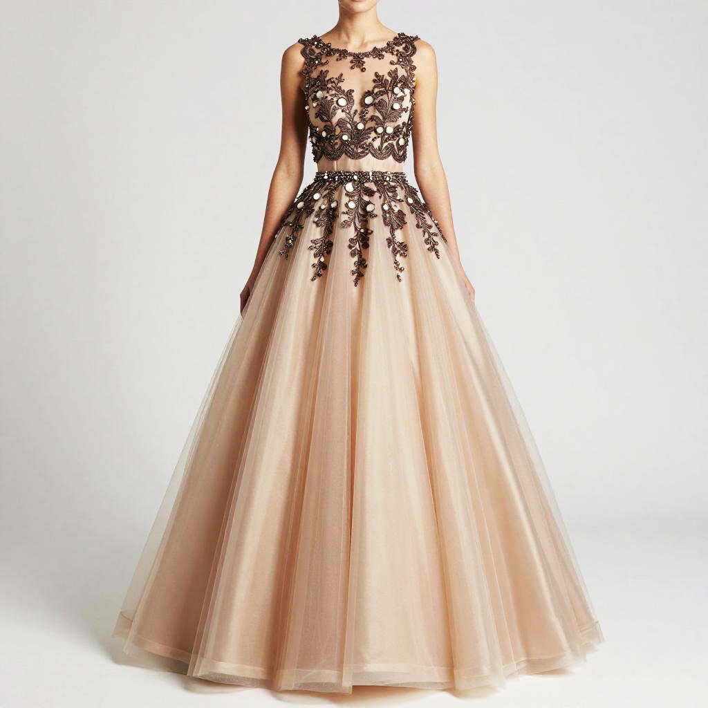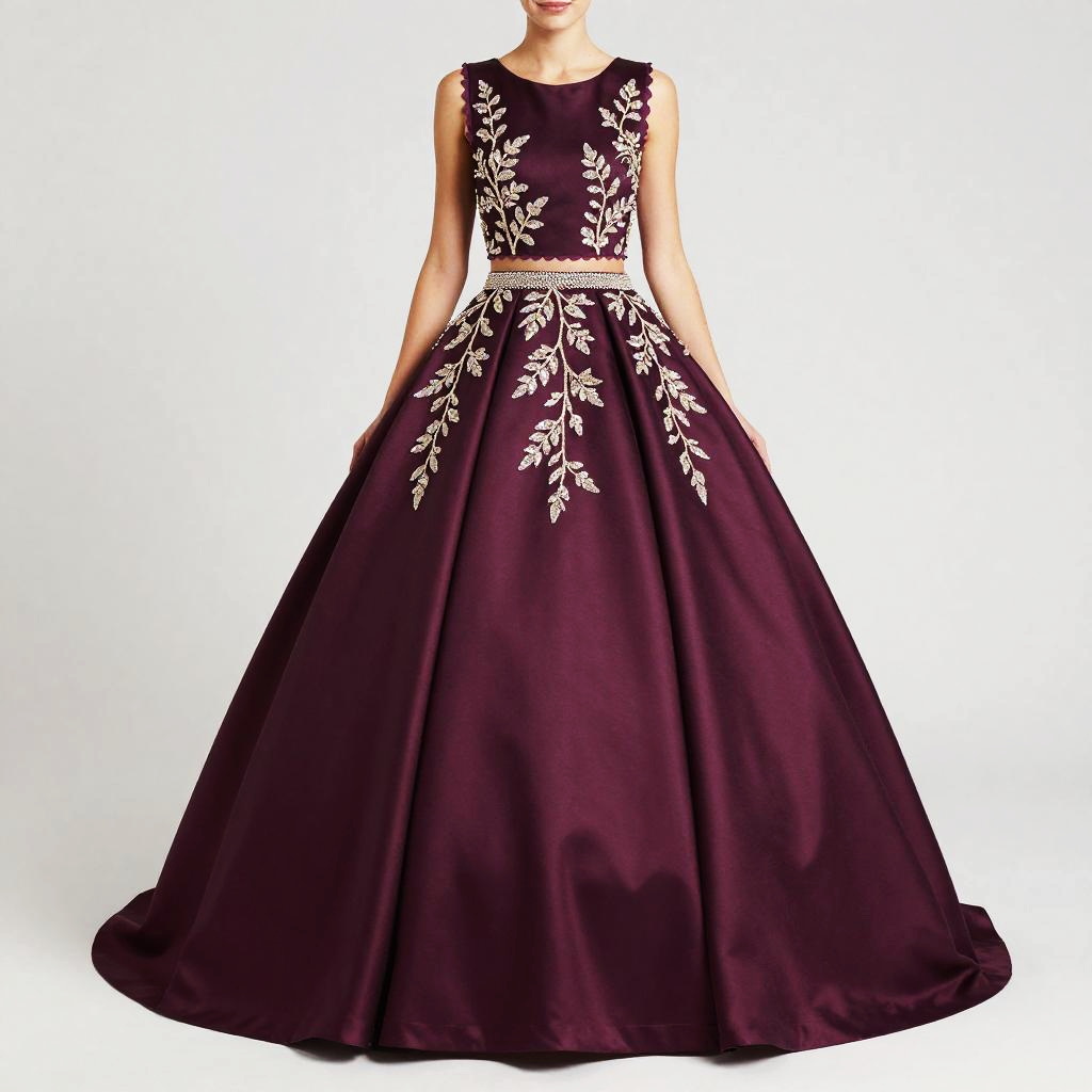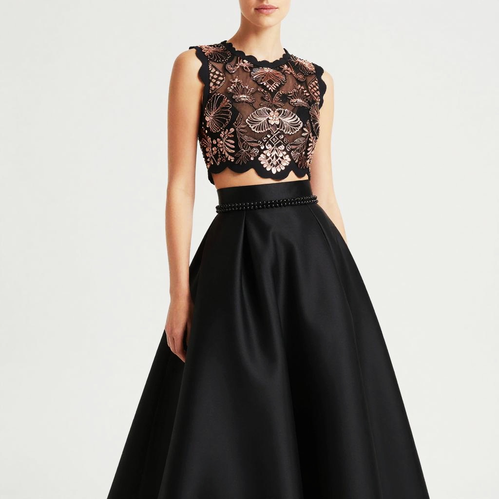 Woman, formal occasion, two-piece ivory and blush satin ball gown (sleeveless scalloped cropped top with round neckline and high-waisted voluminous floor-length skirt), sleeveless cropped top with scalloped edge, hand-embroidered mother-of-pearl and ivory lace with subtle gold beadwork on bodice and beaded waistband, round neckline, high-waisted voluminous ball skirt, smooth satin fabric, floor-length, beaded waistband, white studio background