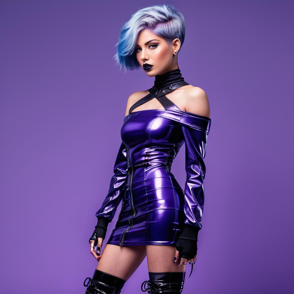 Image in the style of edgy fashion influencer, short jetted blue hair, athletic figure, (Leather & Latex Off-Shoulder Dress:1.3), metallic purple mini dress, combat ankle boots, metallic silver cityscape studio background