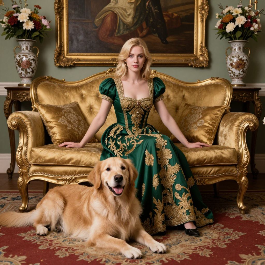 A photograph of a blonde woman with fair skin, wearing an ornate green dress with gold embroidery, sitting on an opulent gold sofa. A golden retriever with a happy expression lies in front of her on a patterned red rug. The background features a large, framed painting and two floral vases on either side of the sofa. The room has a luxurious, vintage vibe.