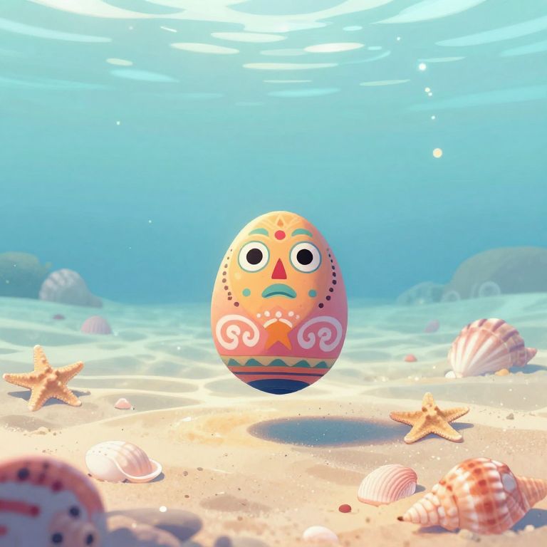 Artistic rendering of Pyukumuku floating gently over a sandy seafloor strewn with seashells and starfish, soft pastel tones dominate the image, enhanced by subtle underwater currents and shimmering light reflections, evoking calm and tranquility.