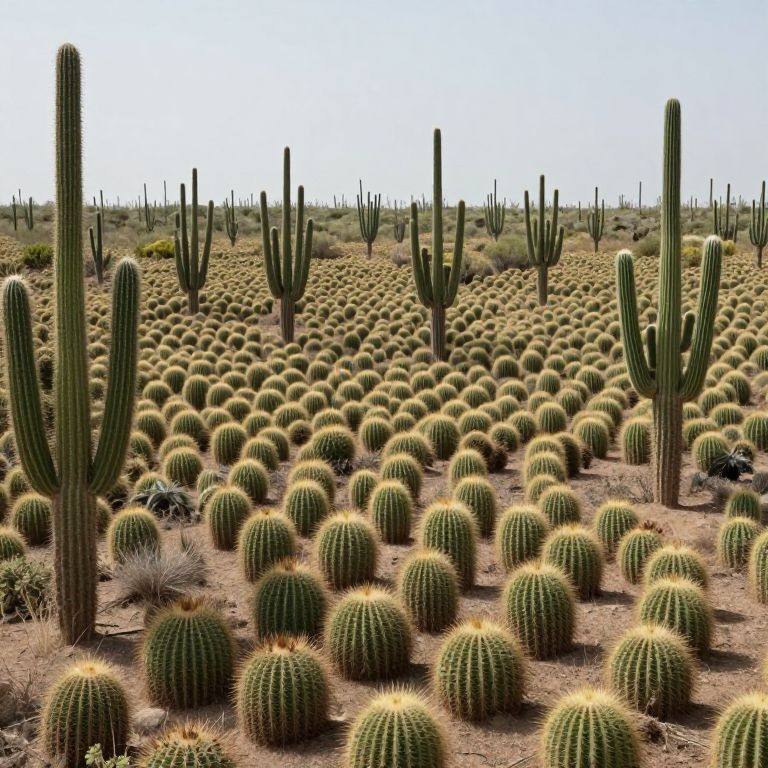 Photograph of a vast desert landscape filled with numerous spherical green cacti and tall, vertical columnar cacti under a clear blue sky.