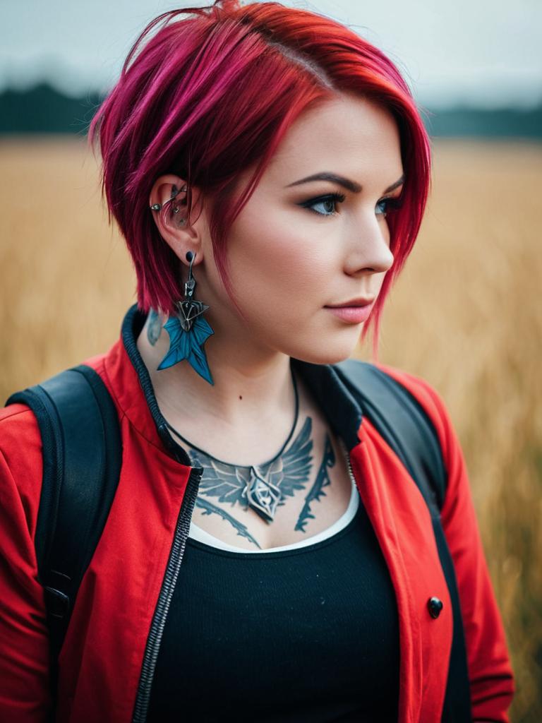 Photo-realistic cosplay photo of person in arcane vi costume. 1girl, ear piercing, blue eyes, short hair, red hair, pink hair, facial tattoo, neck tattoo, red jacket, nose piercing, sidecut, bandaged armlifestyle stock photo, shallow depth of field, lifestyle stock photography, shallow depth of field, natural lighting, warm tones, soft background blur, candid moments, vibrant colors, realistic textures, modern casual clothing. full body shot