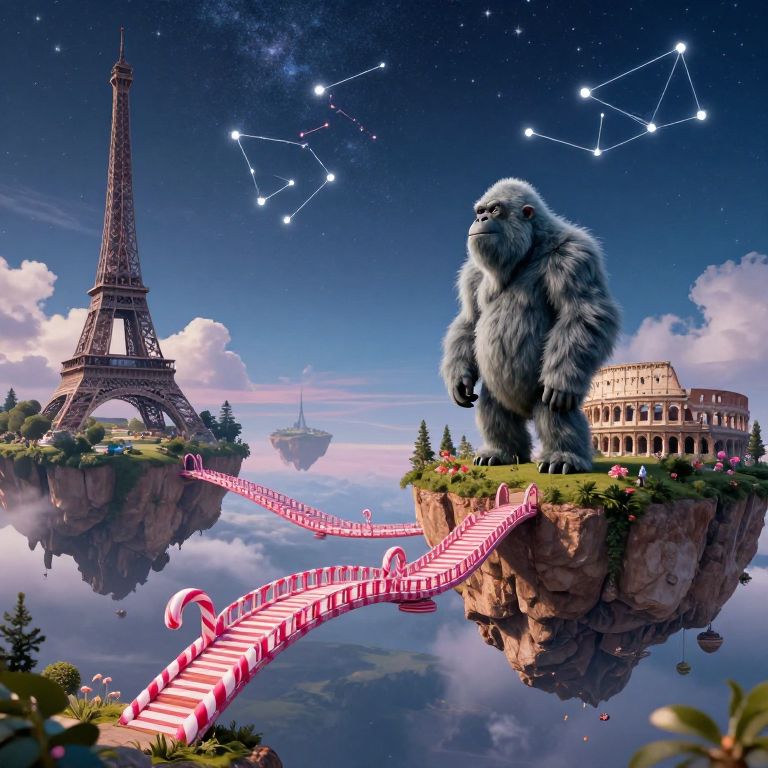 Craft an image that embodies surrealism, depicting a dreamlike landscape with floating islands hovering in mid-air, linked by whimsical bridges fashioned from vibrant candy canes. Upon one island, a regal yeti stands, its gaze fixed upon the starlit sky where constellations take the form of iconic landmarks like the Eiffel Tower and the Colosseum. This panoramic scene should elicit a sense of awe and inquiry as it melds fantastical elements with precise architectural details into an emotionally resonant tapestry of hues and forms, inviting viewers to ponder the wonders concealed within their imagination's reach.