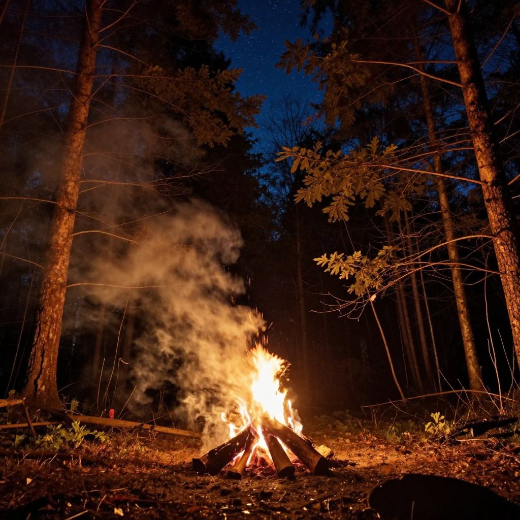 Add smoke to photo of a forest campfire at night, thick curling smoke rising into the starry sky, warm firelight illuminating surrounding trees, creating a cozy yet mysterious ambiance with shadows dancing.