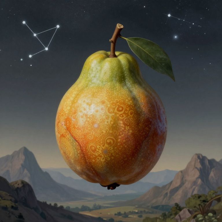 Digital illustration of a large, detailed pear with a yellow-orange gradient and intricate circular patterns on its skin, floating against a night sky. The pear has a brown stem and a green leaf. In the background, a starry sky features a constellation, and rugged mountains and a valley are visible. The color palette includes deep blues, purples, and greens, with the pear being the central focus. The texture of the pear is smooth with a glossy finish, contrasting with the rough, rocky mountains and the soft, distant landscape.