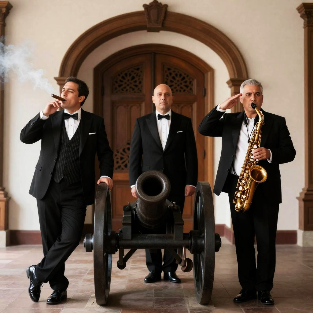Photograph of three men in black tuxedos and white shirts. One man on left, smoking cigar, leaning on cannon, wearing striped vest. Middle man, bald, standing behind cannon. Right man, gray-haired, holding saxophone, saluting. Indoor setting with wooden arch and ornate door in background. Smoke from cannon. Three men, formal attire, musical instrument.