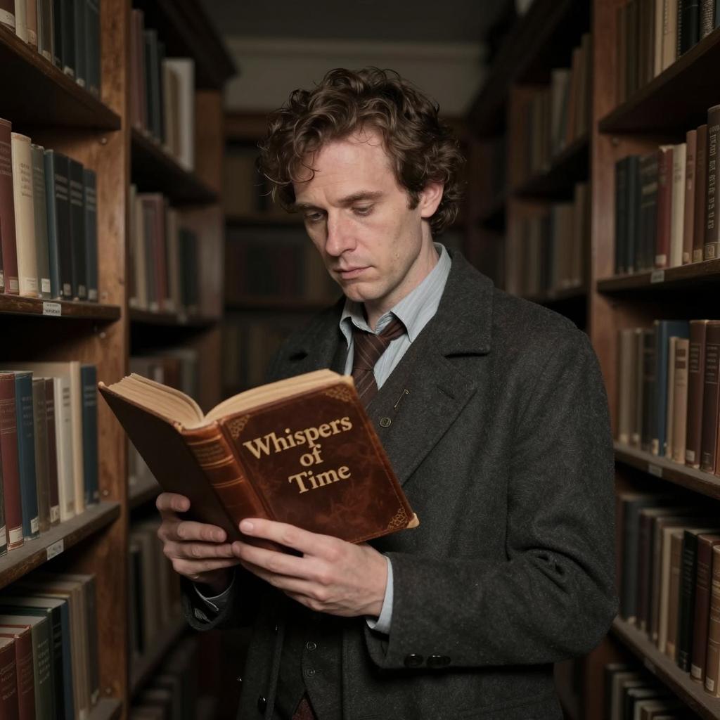Vivid Create a mysterious and haunting representation of Dr. Alexander Thorne in a dimly-lit antiquarian bookstore, holding a peculiar leather-bound tome titled Whispers of Time. Use a digital camera with a low light sensitivity and a wide-angle lens to capture the moody atmosphere of the scene. Choose a desaturated and muted color palette to create a sense of mystery and intrigue. Frame the image with Dr. Thorne as the central figure, with the dusty shelves and books adding to the overall ambiance. Use a shallow depth of field to create a sense of focus on Dr. Thorne and the mysterious book, creating a sense of suspense and curiosity.,
