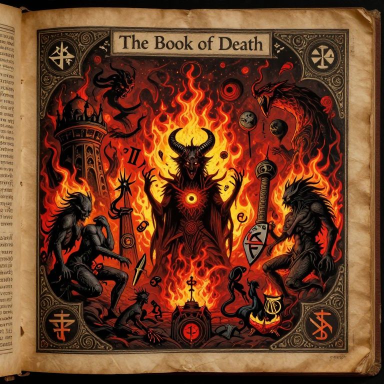 Illustration of "The Book of Death" page, featuring a fiery central demon surrounded by black, horned creatures wielding weapons and symbols, set against