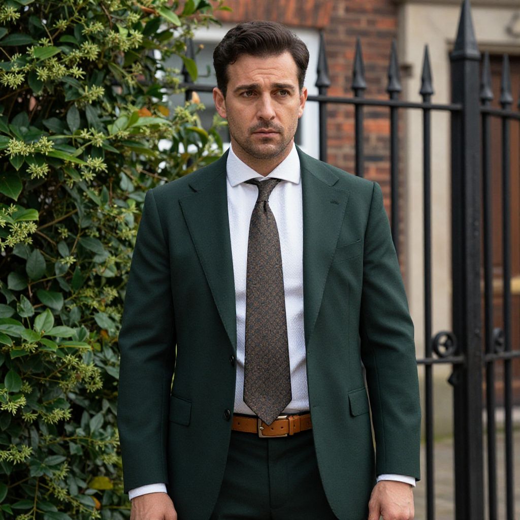 Photograph of a handsome, white man with short, dark brown hair and light stubble, standing outdoors. He wears a dark green suit, white dress shirt, and brown patterned tie, with a brown leather belt. His expression is serious and focused. In the background, there's a black wrought-iron fence and lush green foliage. The building behind him has red brick walls and a white window. The lighting is natural, highlighting his clean, sharp attire and the textures of the foliage and brickwork.