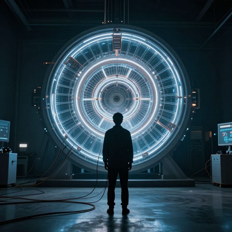 A person stands in a dimly lit room, facing a large, intricate, glowing circular electric apparatus connected to their soul by cables, with surreal lighting and a fusion reactor in the background.