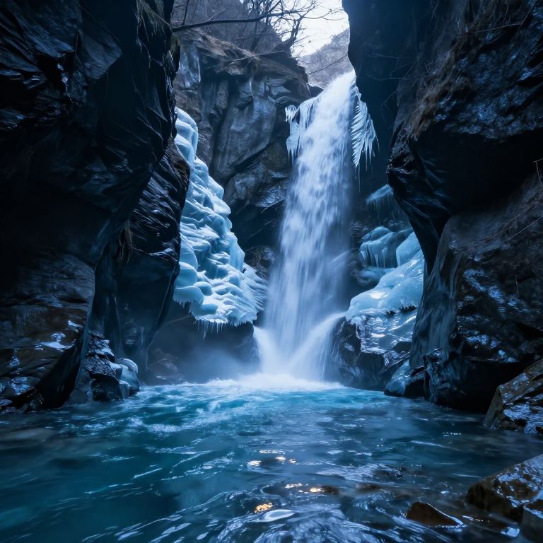 Photograph of a serene, icy waterfall cascading between dark, jagged rocks, with vibrant blue water and icicles, set in a misty