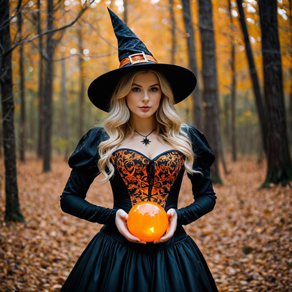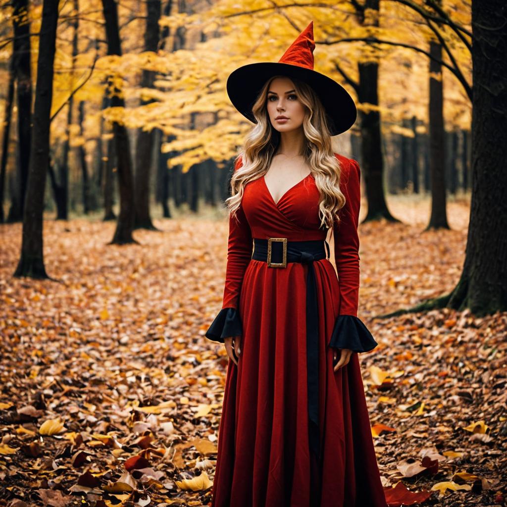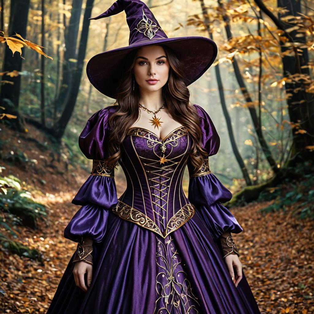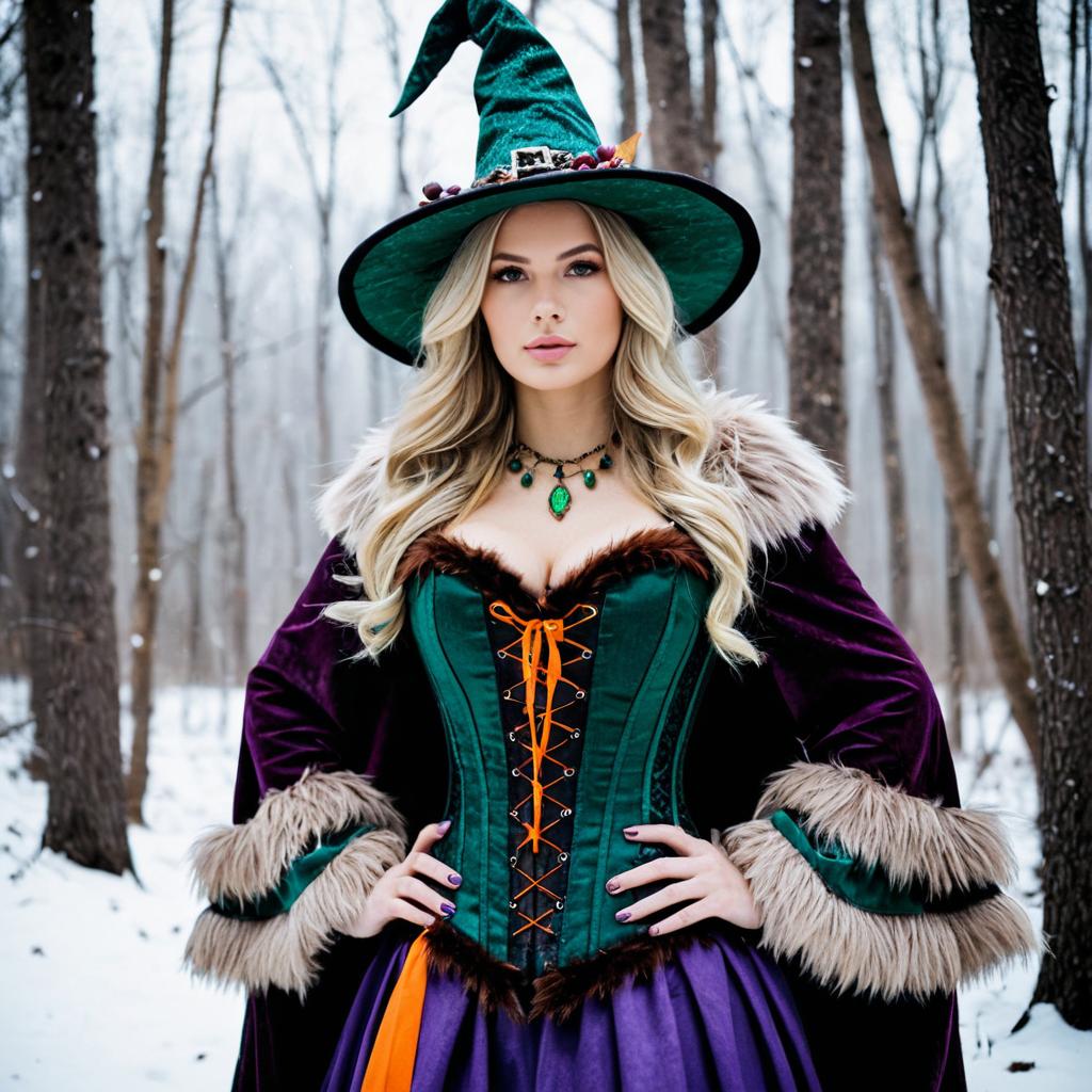 Winter witch costume, photograph of a blonde woman, winter forest background, wearing a green and purple witch costume, corset with lace-up front, long purple skirt, beige fur sleeves, green witch hat with orange and blue accents, blue pendant necklace, long wavy hair, serious expression, red berries on left, snowy trees in background, overcast light, fantasy theme, cosplay, detailed clothing ures, natural light, realistic style