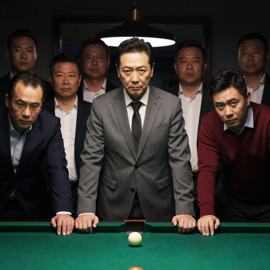 Group of seven men around a green pool table, centered on a middle-aged man in a gray suit with a black tie. Men wear suits and one in a red sweater. Intense expressions. Background includes dim lighting and a mirror.