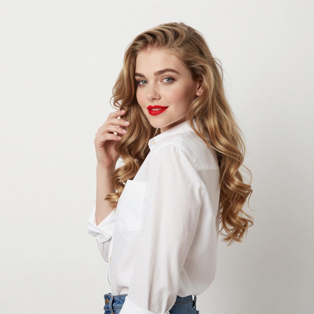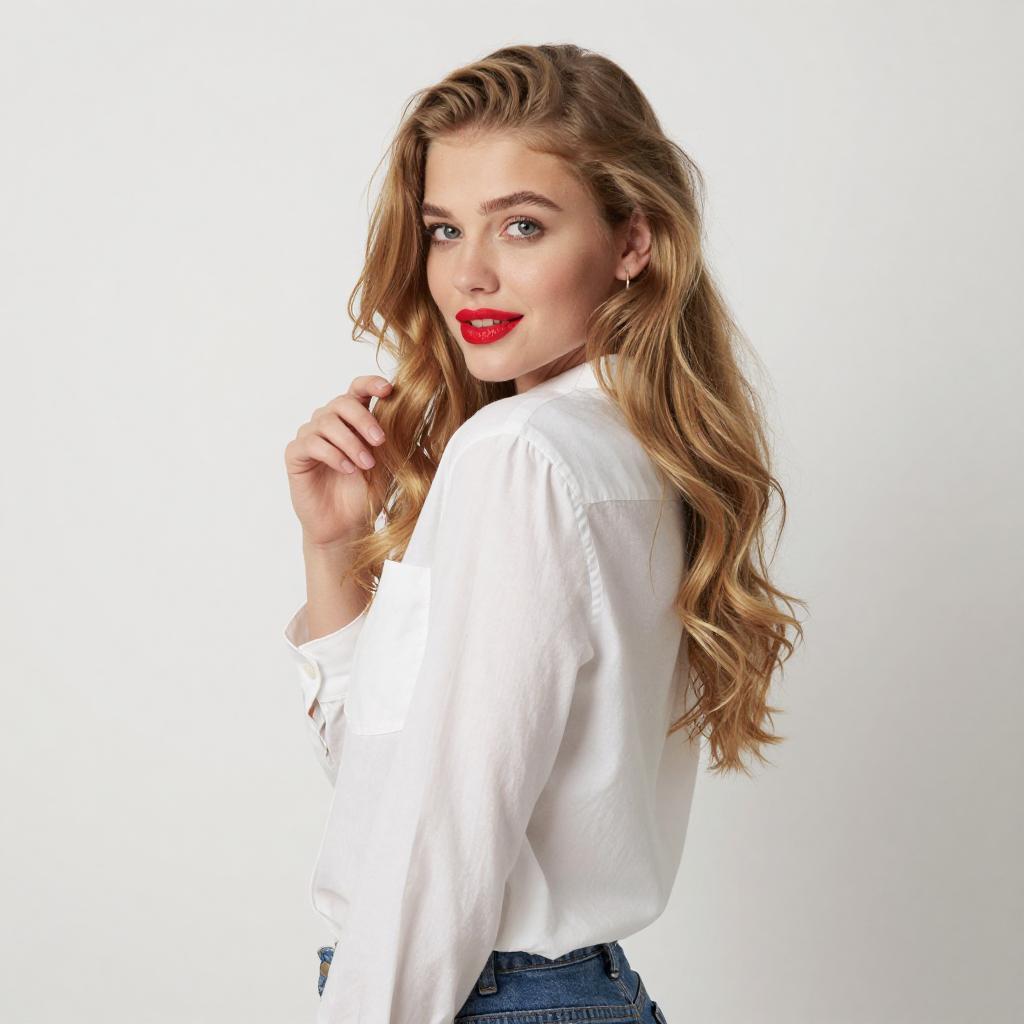 Photograph of a young woman with long, wavy blonde hair and fair skin, wearing a white button-up shirt and blue jeans. She has bright red lipstick and is looking over her shoulder with a slight smile. Her right hand is gently touching her hair. The background is a plain, white ured wall.