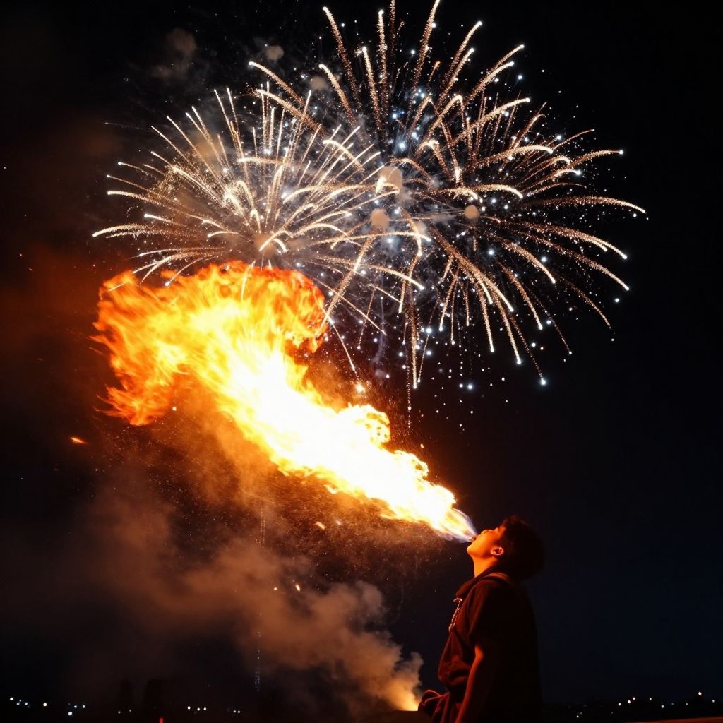 Breathing fire firework celebration, a warrior breathing flames that transform into dazzling fireworks, set against a starry night background, epic and magical atmosphere