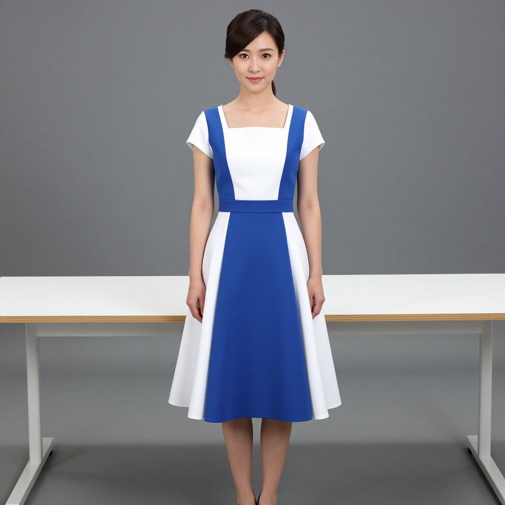 Photograph of a young woman with fair skin and black hair in a neat bun, standing against a gray backdrop. She wears a knee-length, short-sleeved dress with a white bodice and blue accents on the sides and skirt. The dress has a simple, clean design with a square neckline. She stands in front of a white-lit wooden table that runs horizontally across the midground. Her expression is neutral, and her hands rest by her sides. The overall style is minimalist and modern.