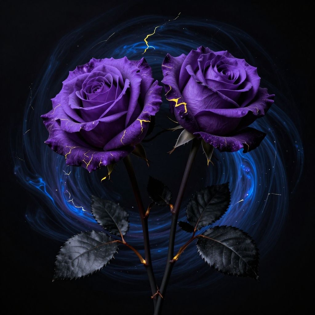 Ultra realistic 8k, masterpiece, dark, two luscious amethyst roses, black background, yellow cracks, (dark black leaves and stem), (blue nebula swirls, cracks), vortex