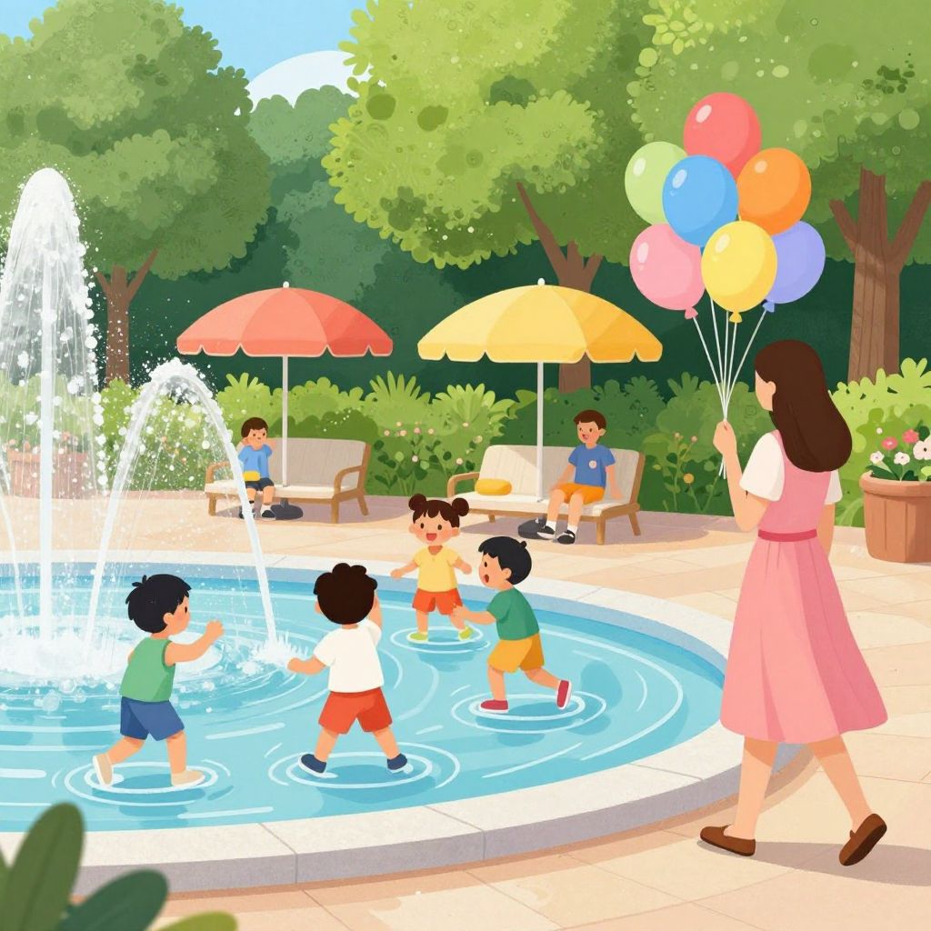 A vibrant digital illustration depicts children joyfully playing in a water fountain plaza, surrounded by lush greenery and bright umbrellas, while a woman in a pink dress walks alongside carrying a colorful bouquet of balloons, capturing a lively and cheerful summer scene with vivid colors and detailed textures.