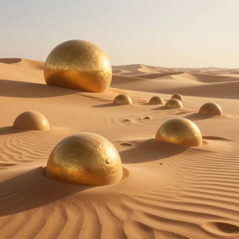 Photograph of a surreal desert landscape featuring numerous golden, dome-shaped objects scattered across rippled sand dunes. The domes, varying in size, have a smooth, shiny texture that reflects sunlight, giving them a metallic sheen. The sand is a warm, orange-brown color, with subtle shadows and wind patterns visible on its surface. In the background, the sky is clear and bright, enhancing the contrast between the golden domes and the desert. The scene evokes a sense of otherworldliness, with the futuristic, alien-like domes standing out against the natural desert environment.