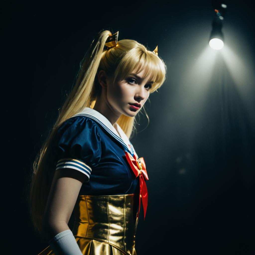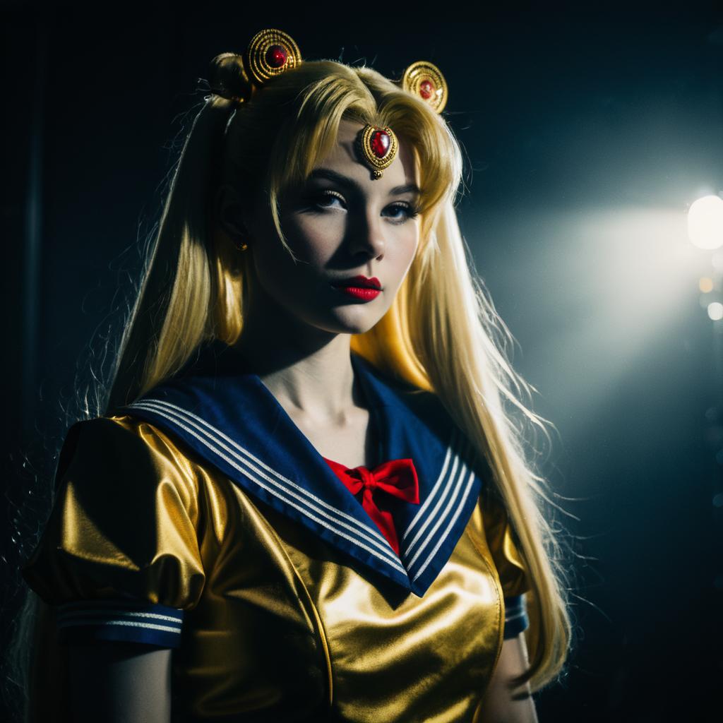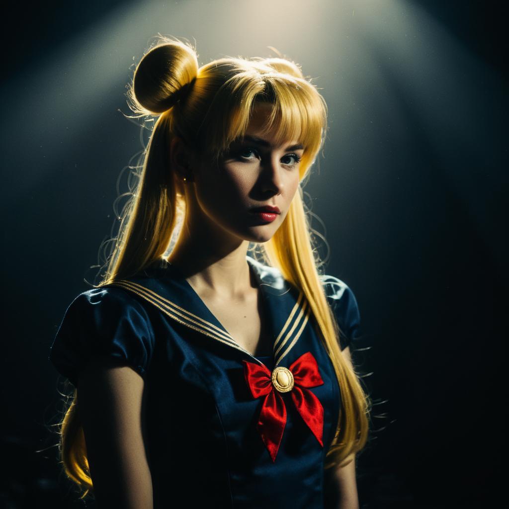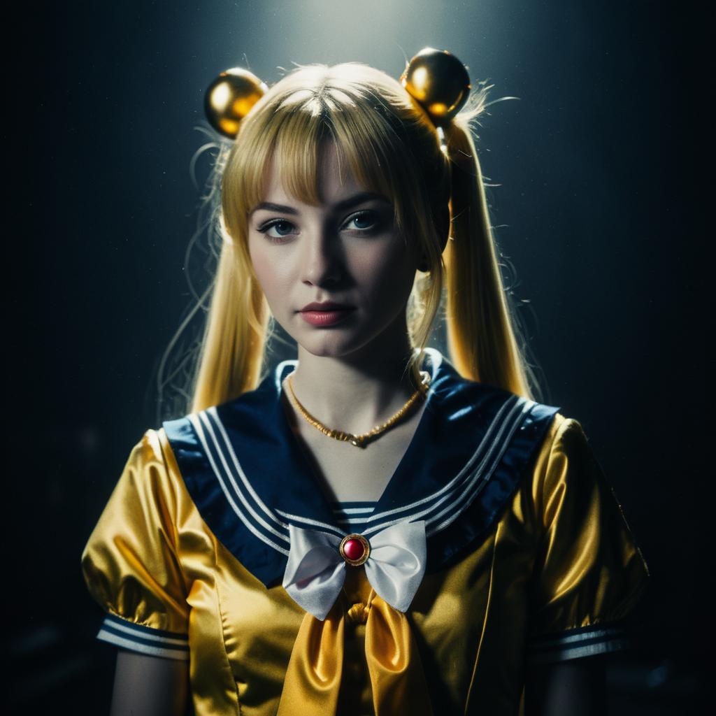 Sexy cosplay woman character wearing Usagi Tsukino (Sailor Moon) costume. Realistic photo. Jane Doe dressed as Usagi Tsukino (Sailor Moon) --sref 1391