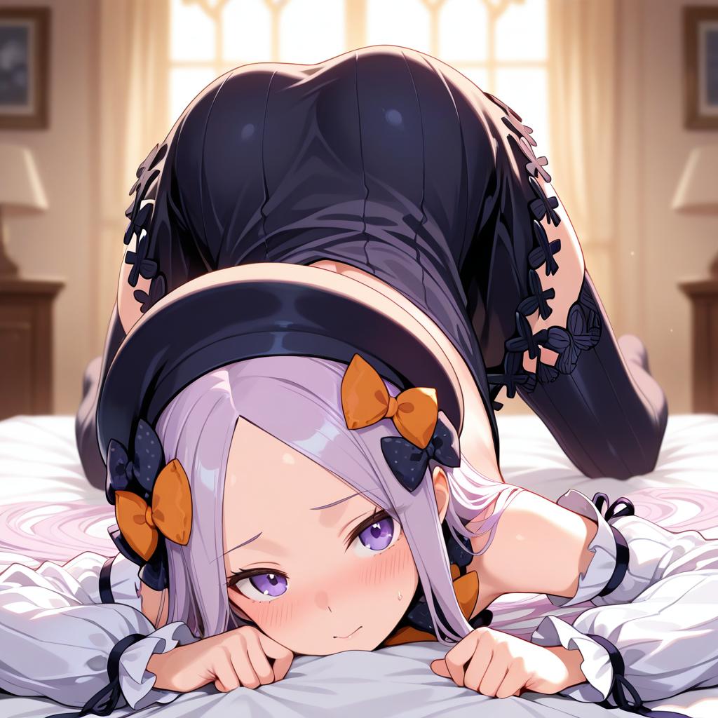 Top-down bottom-up view, abigail williams, fate, 1girl, indoors, on bed, looking at viewer, embarrassed expression, purple eyes, short purple hair, parted bangs, beret, black dress, strapless dress, frills, bare shoulders, black thighhighs, white detached sleeves, blush, soft lighting, vintage, depth of field, self-conscious, gentle glow through window, elegant brocade, intricate leg-cross pose