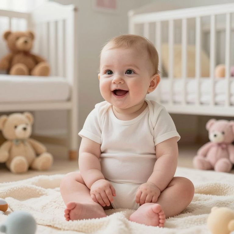 Photograph of a smiling, light-skinned baby with blonde hair, sitting on a soft, white, textured rug in a brightly lit nursery. The baby wears a plain white onesie and sits with legs spread and hands resting on the rug. In the background, there are two brown teddy bears and one pink teddy bear on the floor, with a white crib and blurred window behind them. The baby's large, blue eyes and open mouth convey joy. The room has a soft, warm light, creating a cozy atmosphere.