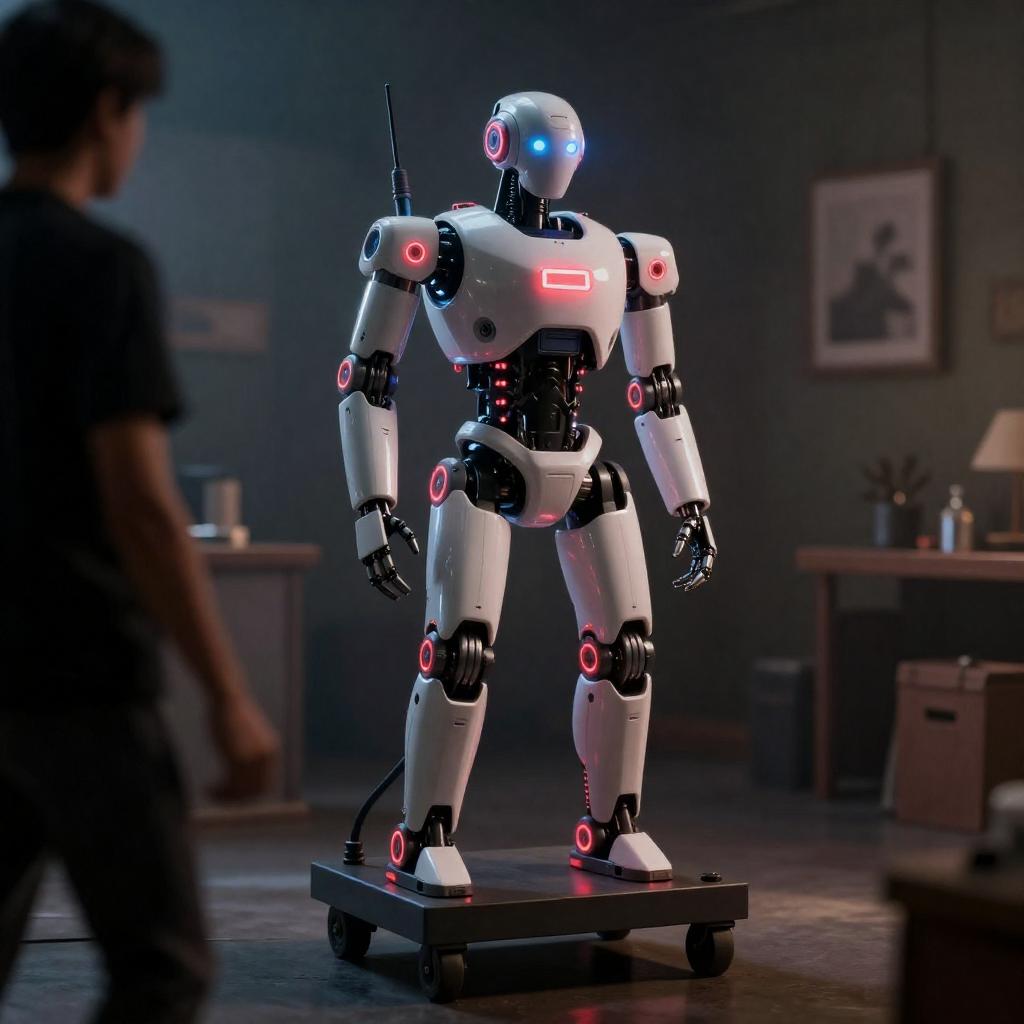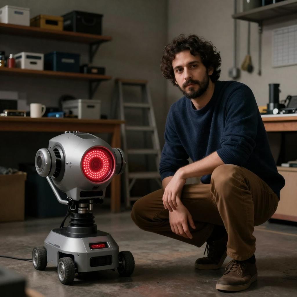 A photograph of a man with dark curly hair and a beard, wearing a dark blue sweater and brown pants, crouching beside a futuristic robotic device with red circular lights in a cluttered workshop. Shelves with various items and a ladder are in the background, illuminated by dim, industrial lighting.