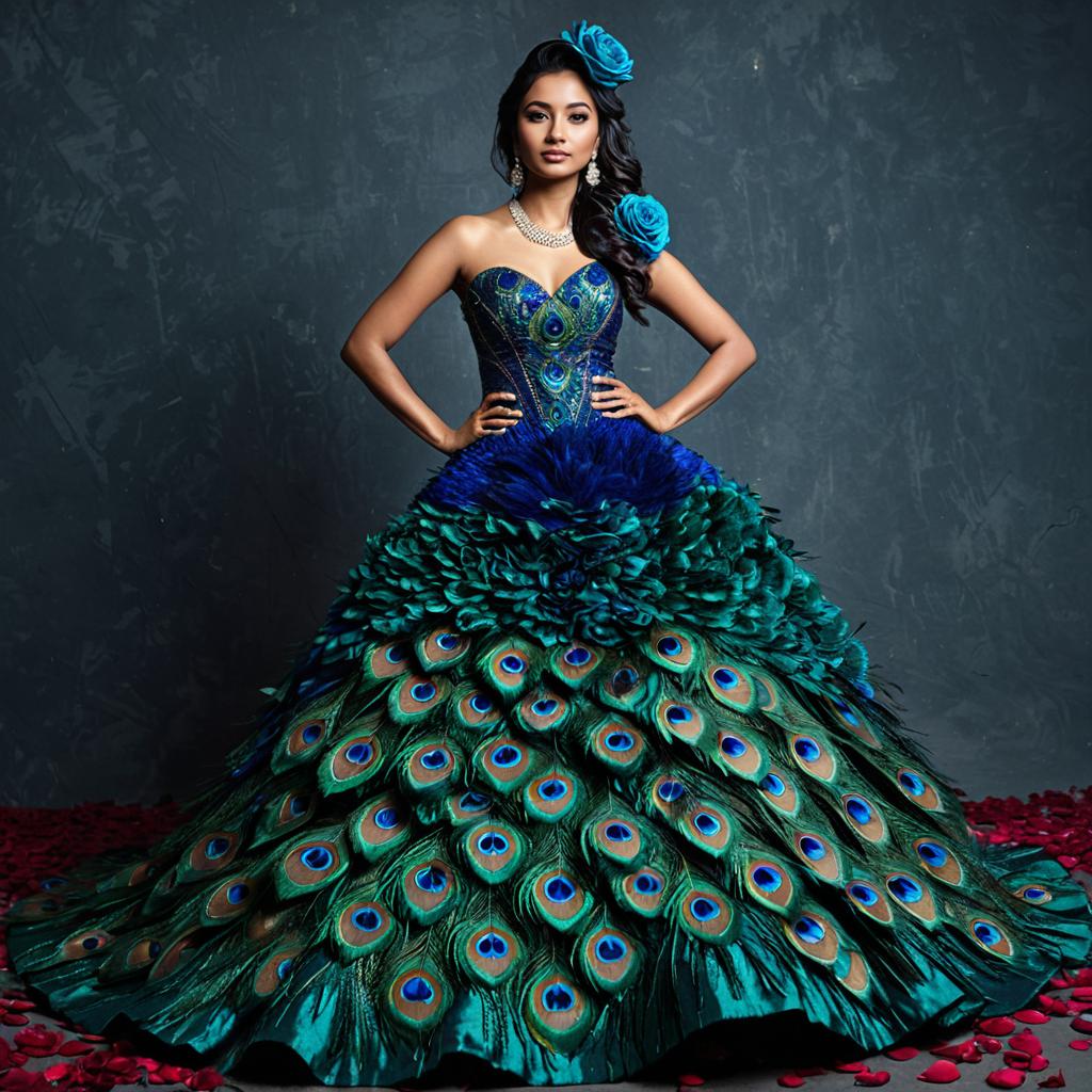 A full body photorealistic beautiful dress made entirely of peacock feathers with peacock feather texture, emerald green and royal blue, worn on a stunning South Asian woman, ((rose)) fashion designed, influenced by rose petals, highly detailed, 8k sharp focus, photorealism