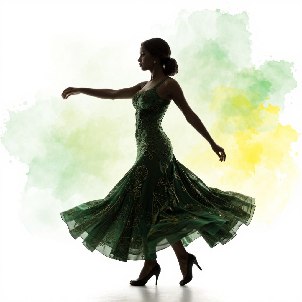 A stunning, hyper-realistic silhouette of a woman spinning on a white background, adorned with volumetric lighting and intricate details, set against a vibrant green and yellow watercolor backdrop.