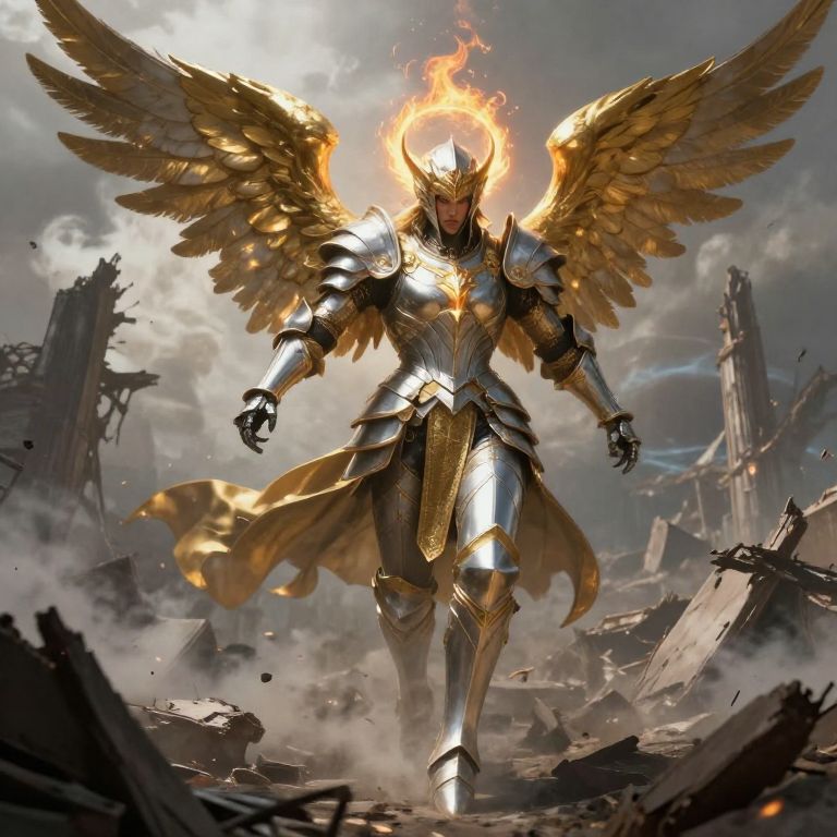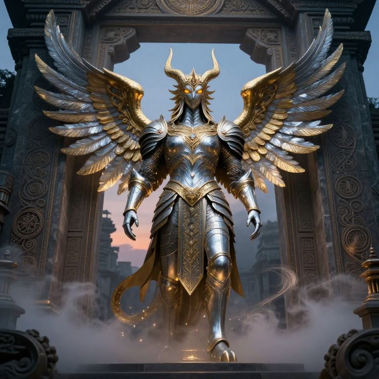 A majestic cerubim standing guard at the gates of a cosmic temple, glowing eyes piercing the twilight, body adorned with ornate armor of shimmering silver and gold, surrounded by swirling mist and ancient celestial symbols etched in the stone.
