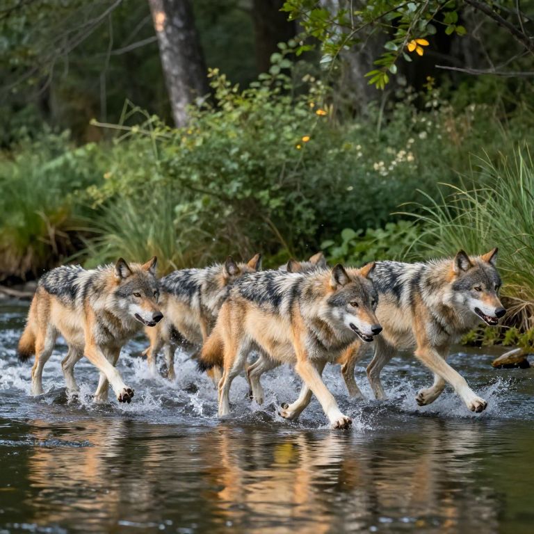 High resolution wolf photography showing a pack of wolves crossing a river at dawn, vivid water reflections, dynamic motion captured perfectly, lush green forest surrounding them, lifelike textures and colors, sharp focus on leading wolf, cinematic nature scene.