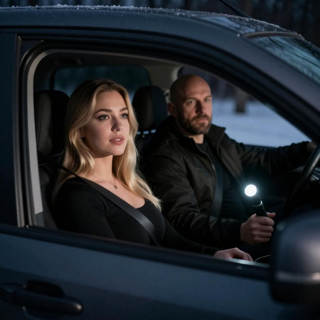 Man and woman sitting inside a dark car at night. The blonde woman wearing a black top is in the passenger seat, looking forward, while the bald man with a beard, dressed in a dark jacket, holds a flashlight illuminating the car’s interior. Snow is visible on the ground outside the vehicle.
