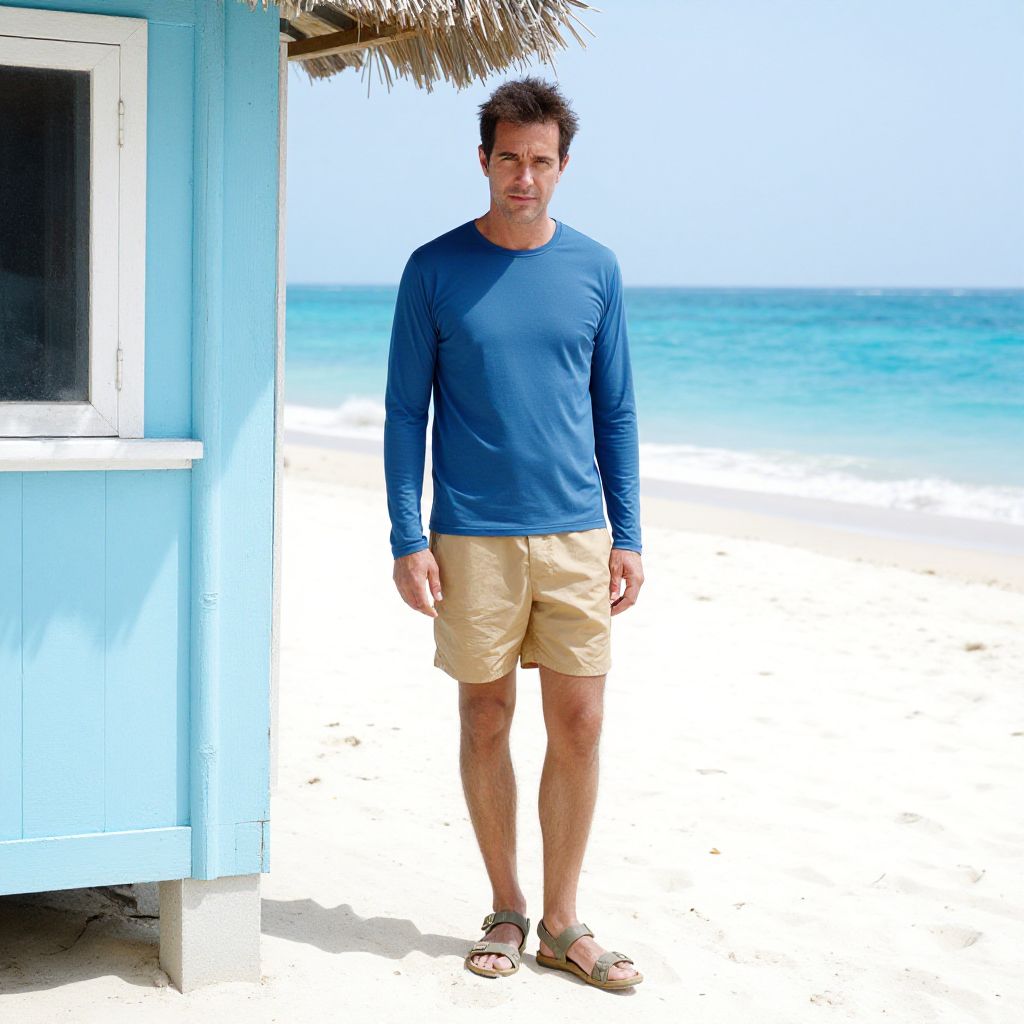 Photograph of a Caucasian man with short, curly brown hair, standing on a sunlit beach. He wears a blue long-sleeve shirt, beige shorts, and brown sandals. His expression is neutral. To his left, there's a light blue wooden structure with a thatched roof and a small window. The background shows a clear blue sky and calm ocean. The sand is bright white, creating a high contrast with the blue elements. The man's stance is relaxed, with his arms by his sides.