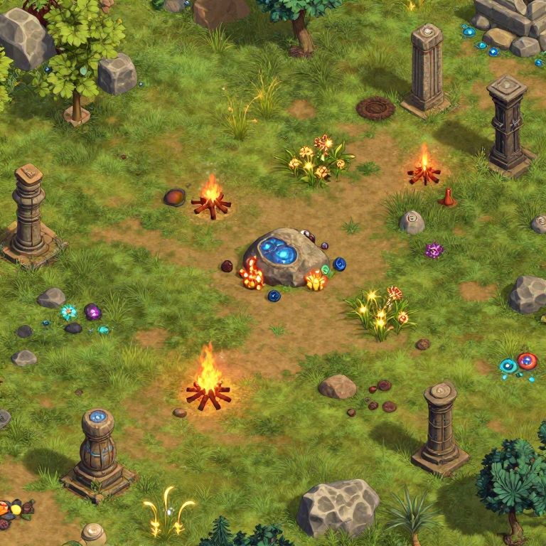 DND open field map depicting a serene open grassland dotted with enchanted stones, mystical glowing plants, scattered campfires, and ancient standing pillars, rendered with vibrant colors and intricate details for immersive exploration.