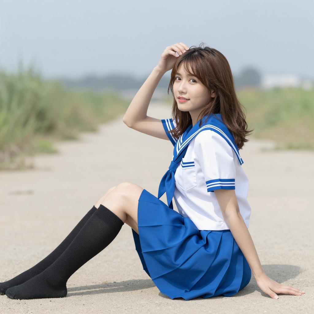 Asian woman with medium-length brown hair sitting on a sandy path. She wears a white sailor shirt with blue trim, blue pleated skirt, and black knee-high socks. She looks over her shoulder with a slight smile. Bright daylight. Background includes blurred green grass and sky. Her right hand touches her head, left leg bent at the knee, right leg extended.