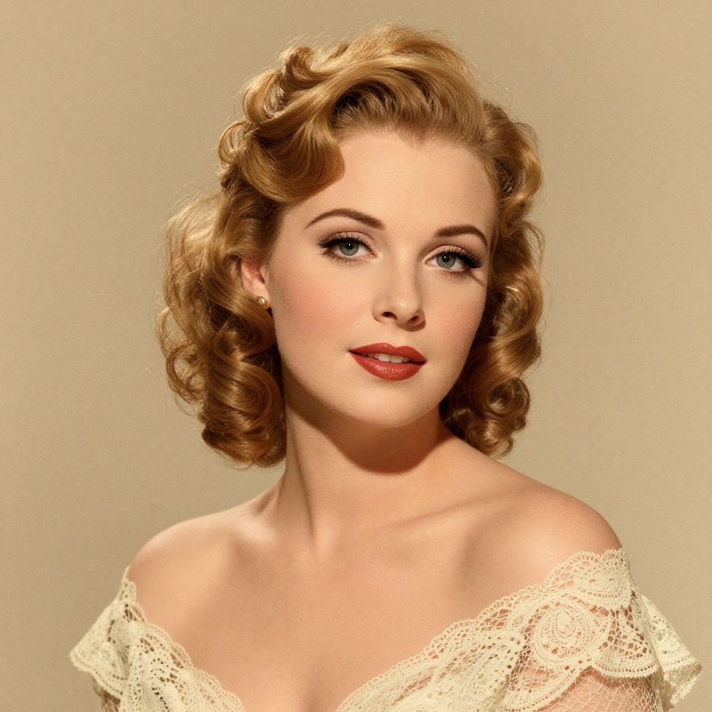 A vintage-style illustration reminiscent of Alberto Vargas' artistry, featuring a woman with elegant, golden curls and a delicate lace dress, rendered in high-definition detail with soft, warm lighting that accentuates her classic beauty.