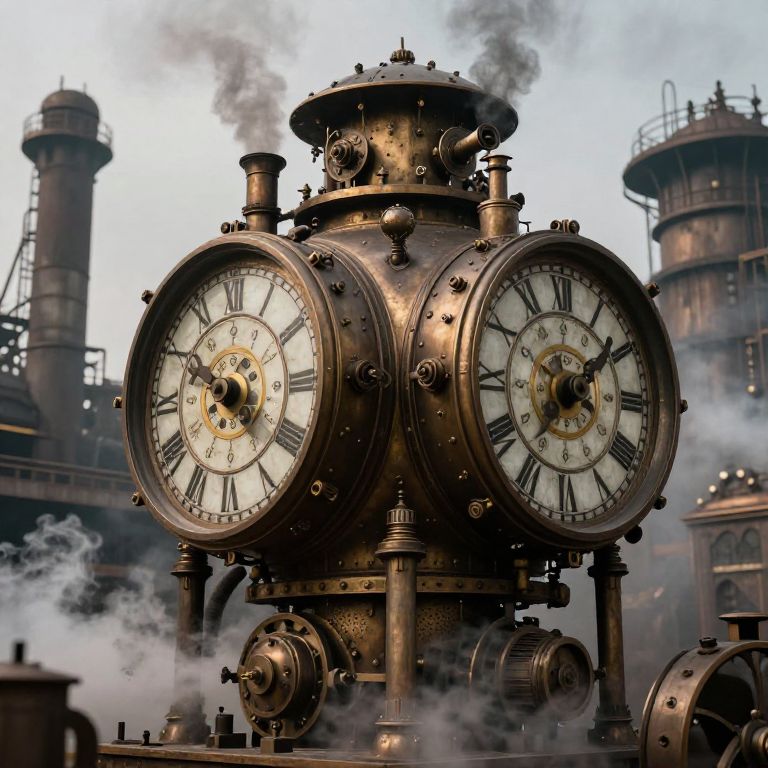 Steampunk time machine with large spinning clock faces and steam exhausts, set against a backdrop of a smoky industrial age factory, emphasizing mechanical complexity and vintage aesthetics