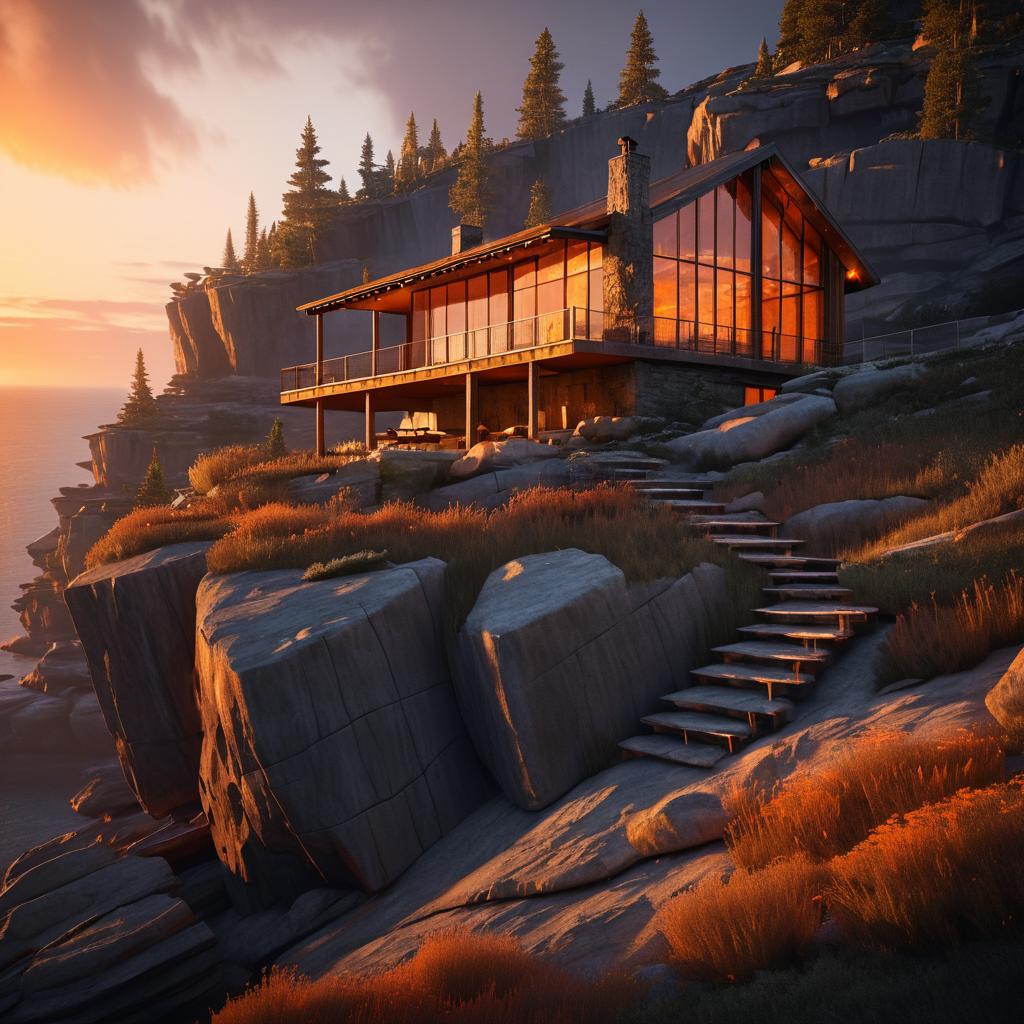 Photorealistic architectural rendering of a modern cabin perched on a rugged cliffside, featuring large glass windows that emit a warm orange glow. The cabin overlooks a vast ocean with dramatic rock formations and pine trees in the background during sunset. A staircase ascends the rocky terrain leading to the cabin's entrance. The scene combines natural and architectural elements in a cinematic style.