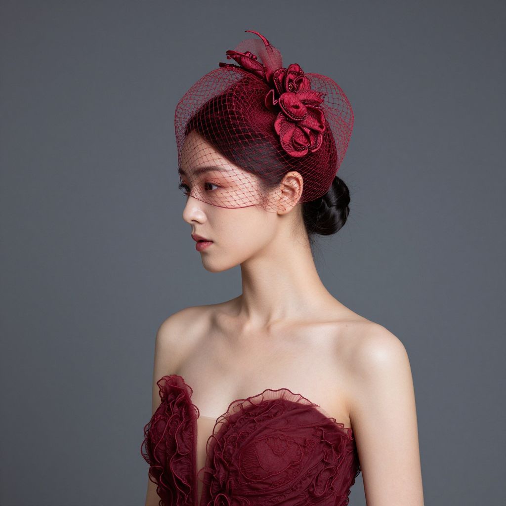 Elegant profile of a woman wearing a striking ruby-red birdcage veil headdress adorned with intricate floral details and sheer netting, complemented by a matching strapless gown featuring ruffled textures and a deep neckline.