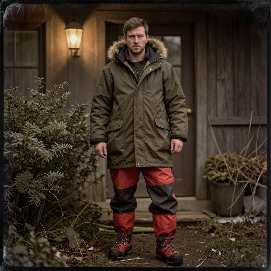 Photograph of a Caucasian man with short brown hair and a stubble beard, standing outdoors in front of a wooden house. He wears a dark green winter parka with a fur-lined hood, red and black snow pants, and red lace-up boots. The house has a dark wooden door, a lit lantern, and potted plants with sparse foliage. The ground is covered in dirt and small twigs. The man's expression is serious, and he stands with his hands by his sides. The image has a moody, overcast lighting with a dark, vignette-style border.